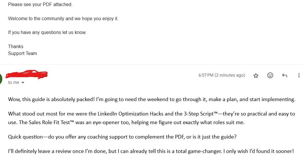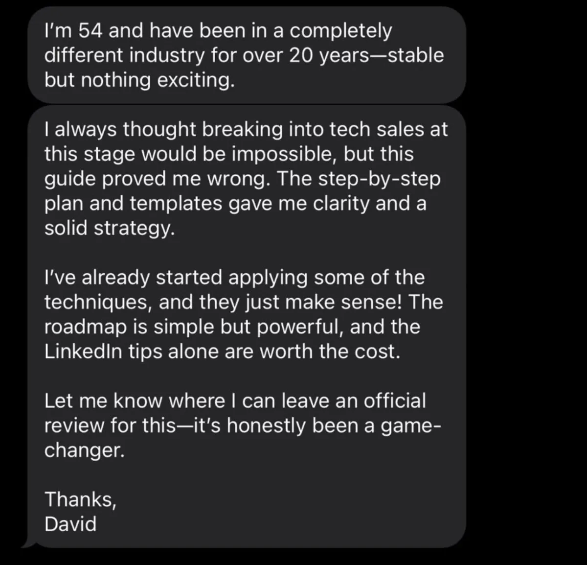 "Everyone talks about getting into tech sales, but no one tells you how. This guide not only tells you but gives you the tools to do it. I’m finally getting responses, and it’s changed my whole perspective on job hunting!"