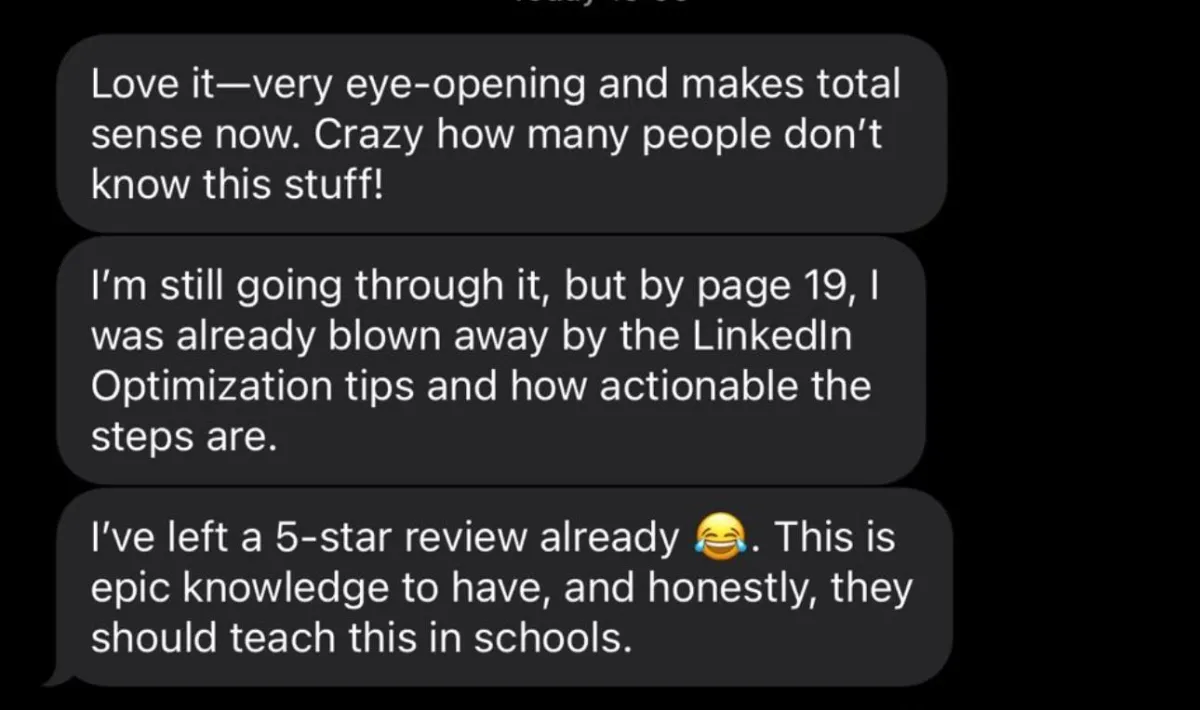 "I’ve tried other resources, but nothing laid it out step by step like this guide. From tailoring my LinkedIn to nailing my interviews, this guide gave me the confidence and tools I needed. Within weeks, I landed my first interview for a tech sales role!."